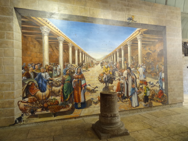 Mural showed a depiction "The Cardio" (main street) in Jerusalem before the Roman Destruction. We are standing in this place as this picture is taken.