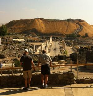 Great example of a "tel" at Beit She An. Where the mound builds in height as different civilizations come and go.